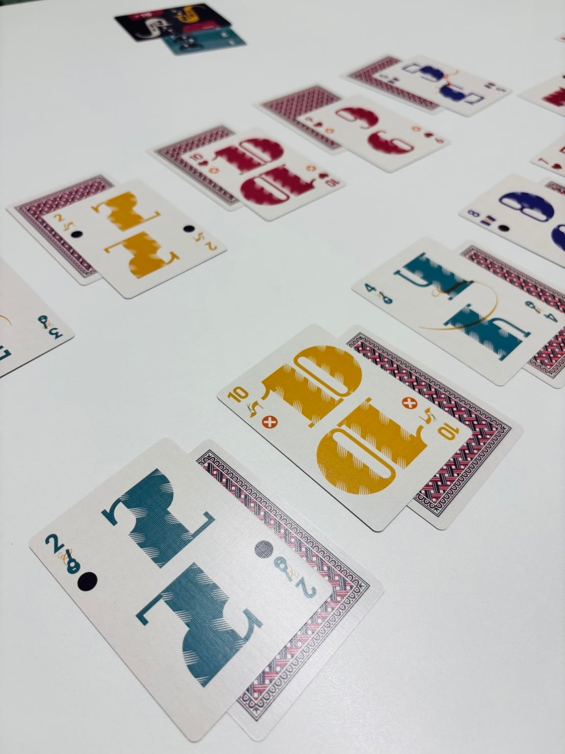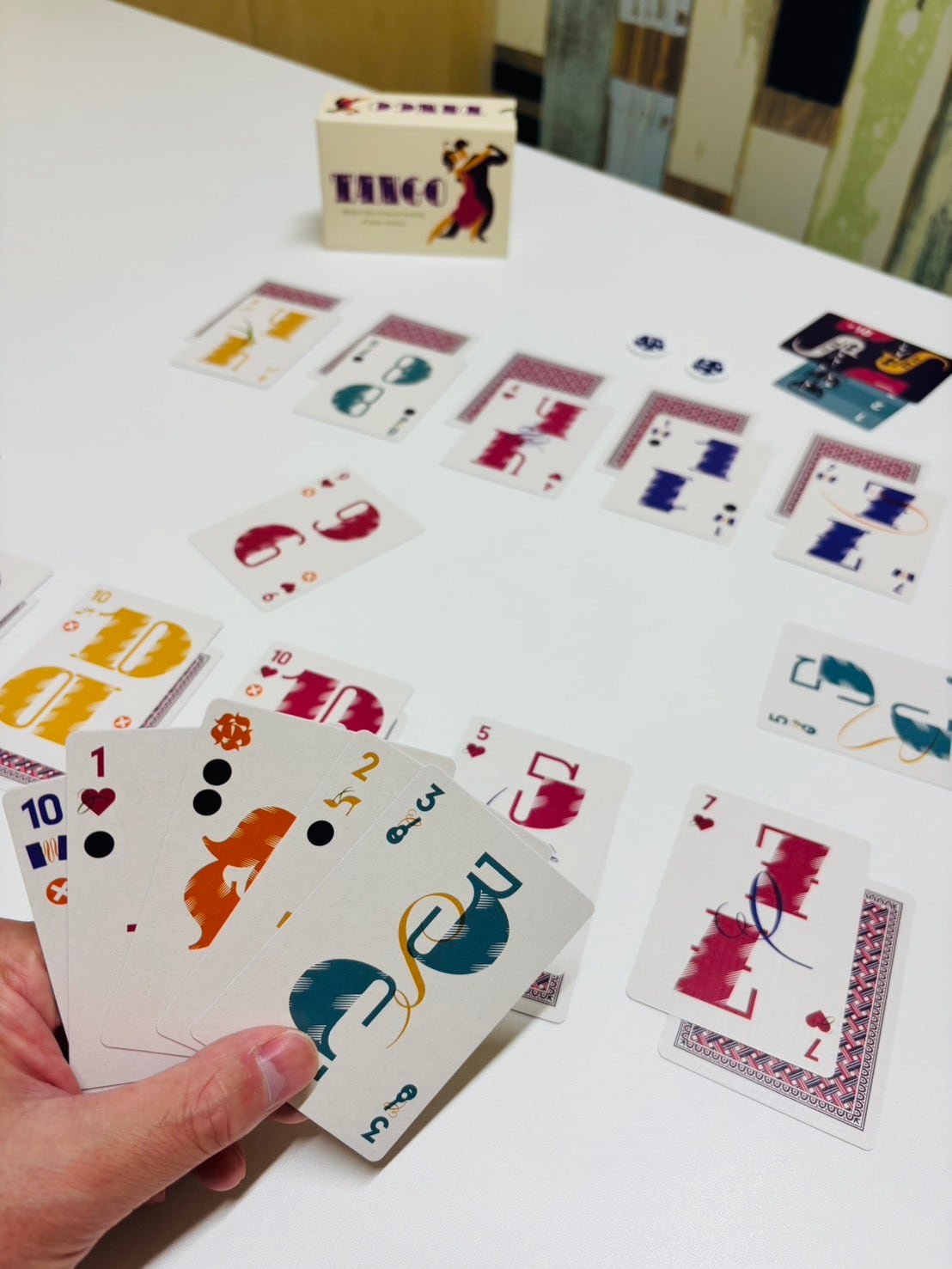 1トリックを手札1枚と手元の公開のカード1枚の計4枚で行うユニークなシステムで、公開されているカードと切り札の状況から行える推測と戦略性がとても面白く、最終的に得点による勝敗となっている点からも一手一手をしっかりと考えるゲームとなっています。ルール自体は難しくないので初心者の方でも簡単に遊ぶことができます。