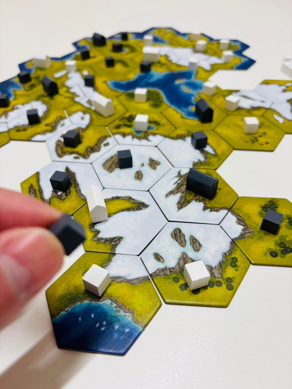 このゲームは2つのフェーズで分かれており、前半の探索フェーズでは交互に山札から地形タイルを引き、条件を満たすようにスタートタイルにつなげて配置していきます。このとき自分のロングハウスコマを置くことができます。後半の定住フェーズでは、自分の置いたロングハウスコマを起点に隣接タイルに自分のバイキングコマを交互に1つずつ置いていきます。置き方により相手の進路を妨害したりすることができ、最終的により多くのバイキングコマを置いたプレイヤーの勝利です。