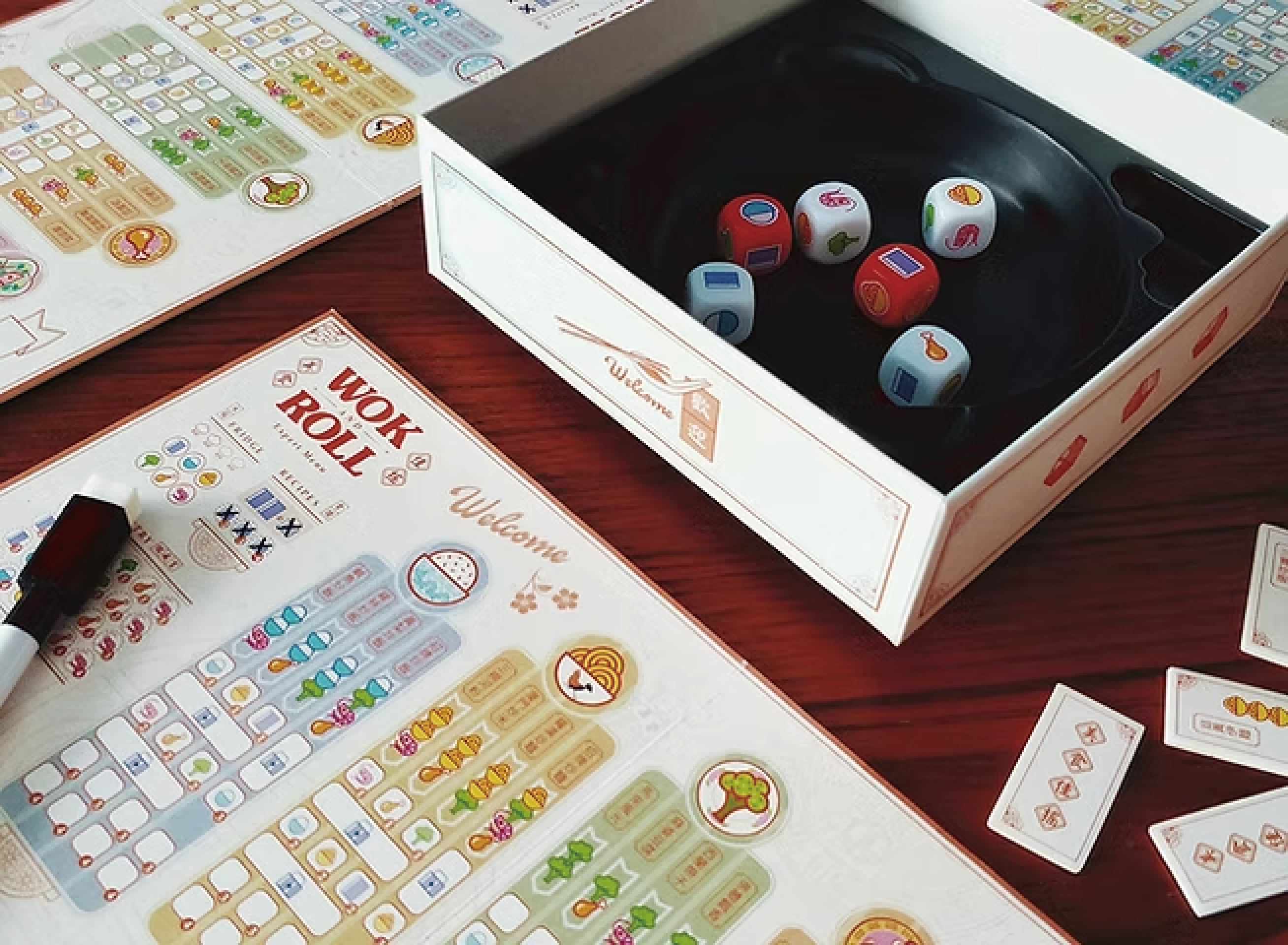 手番プレイヤーは3回まで自由に振り直すことができるダイスを6個振ります。ダイスには食材が描かれており、出目が確定したら手番プレイヤーは6個全て、他のプレイヤーは4個のダイスの出目の食材を使って自分のボードの料理にチェックを入れていきます。作ればつくるほど得点が増えていきます。ダイスの出目に関係なくいつでも食材が取り出せる冷蔵庫を活用しつつ、万能な出目になったり、ボーナス点を獲得するレシピの出目も使いながら3つのコース料理を完成させたらゲームが終了し、最も得点の高いプレイヤーの勝利です。