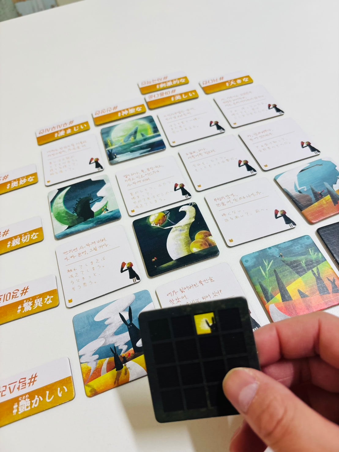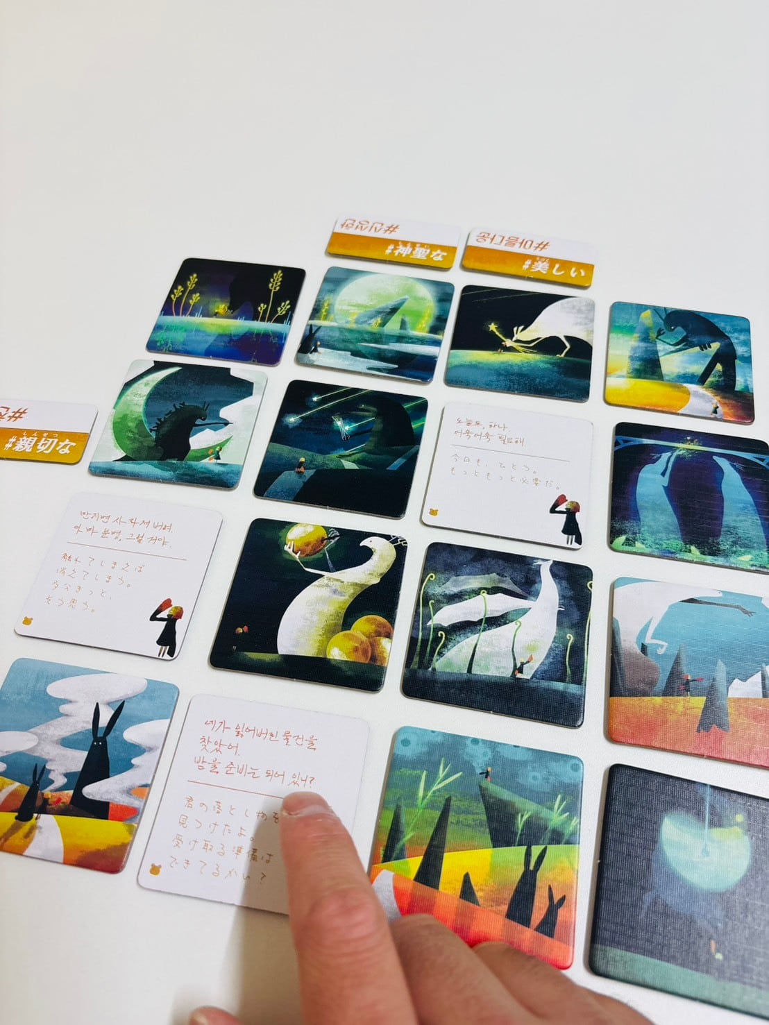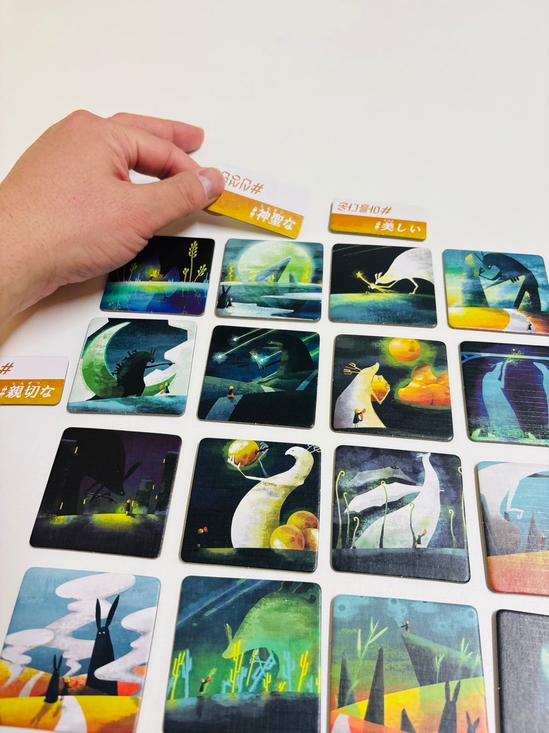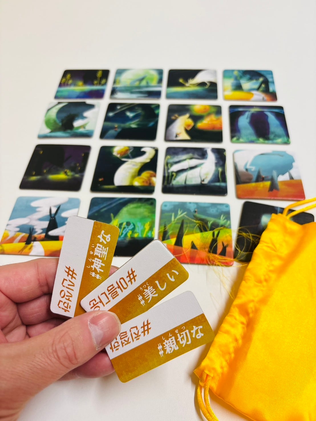 5)親は袋から形容詞タイルを4枚引いて、並んでいる旅行タイルの外周縦か横に列毎設置する