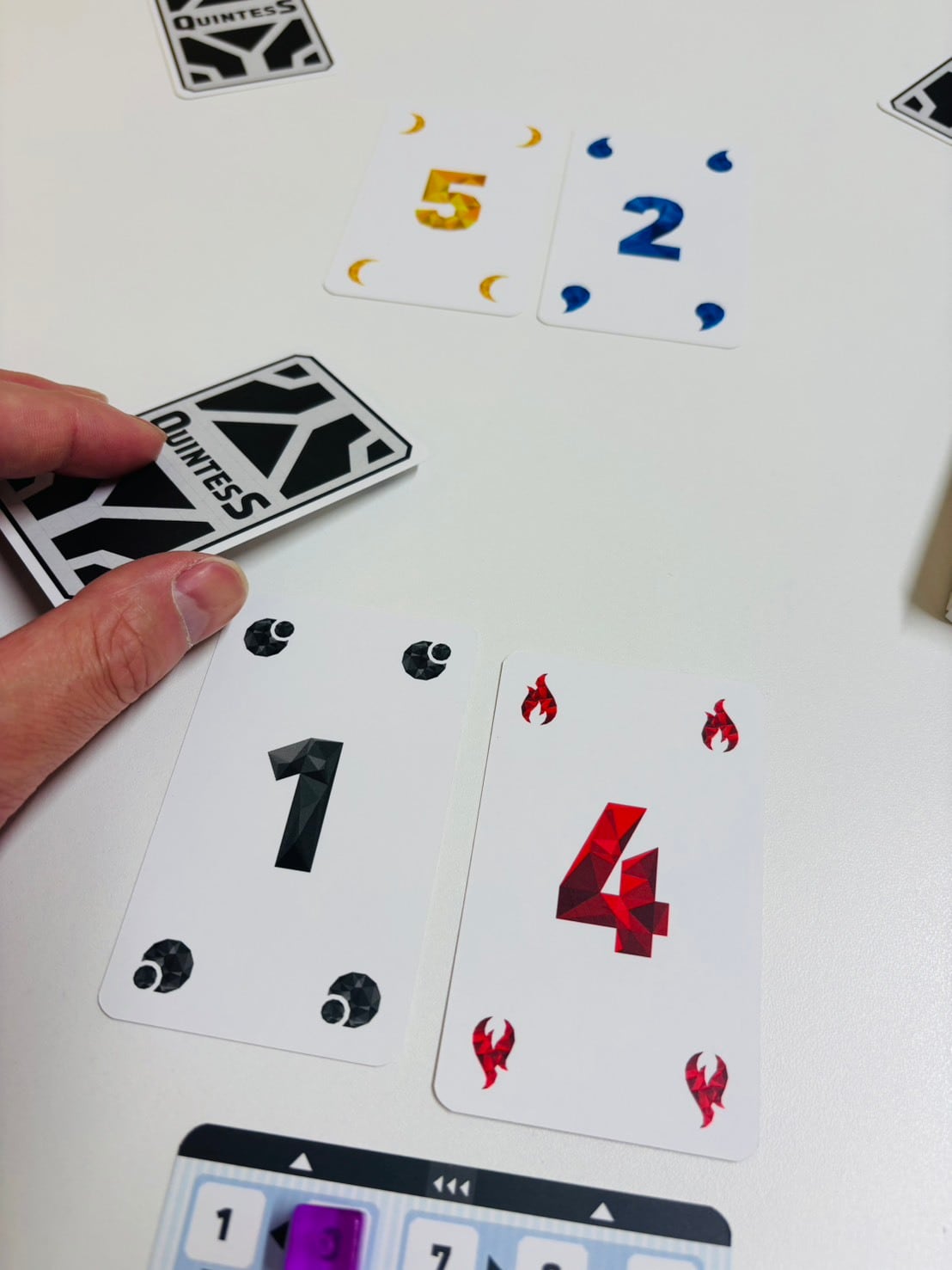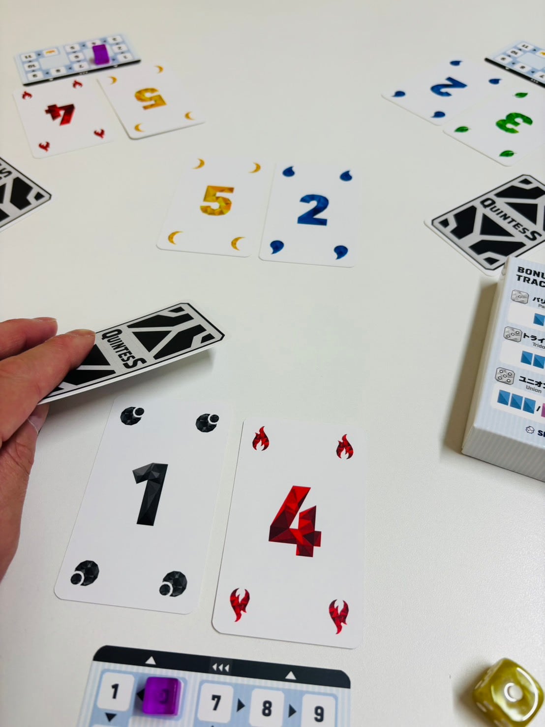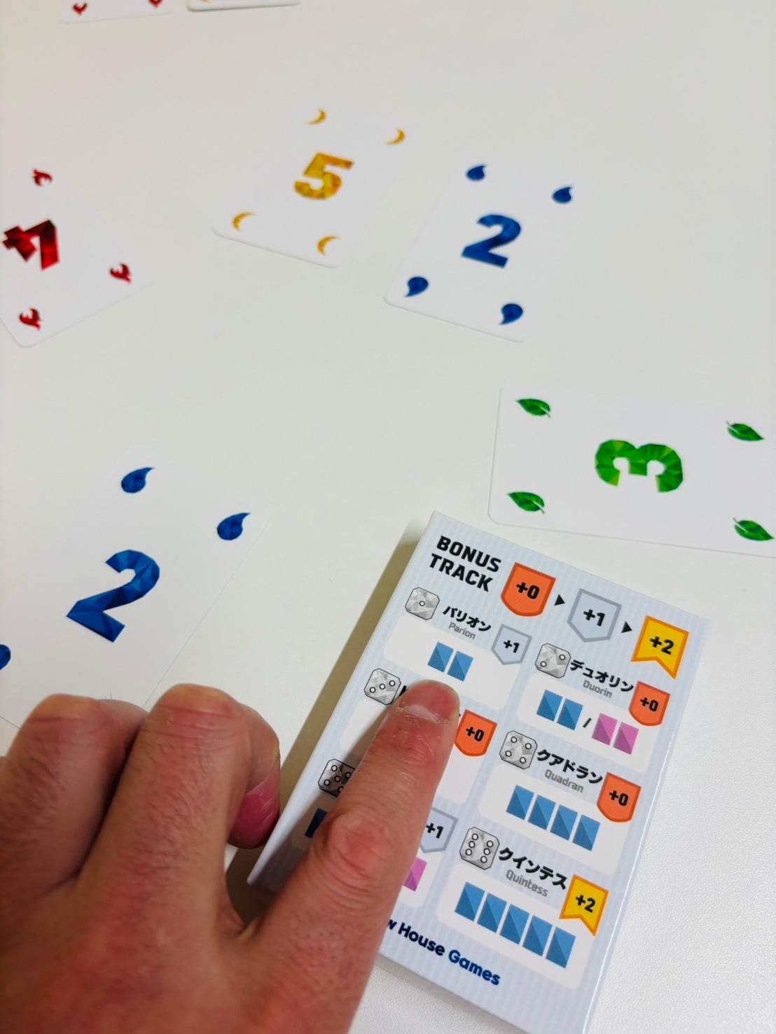 手札にある1~5のカードからランダムに2枚を公開し、残った3枚のうち1枚をウラ向きで出し合い、中央に公開されているカードと合わせて計5枚で完成する最も強い役はどれかを予想します。予想が終わったらカードを公開し、予想が当たった人数が少ないほど高得点が獲得できます。難しい役だとボーナス点が追加、誰も当たらなかったらボーナス点が加算されていきます。