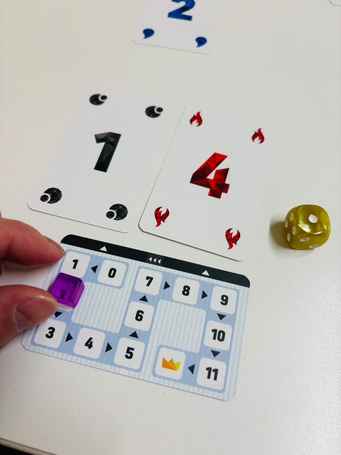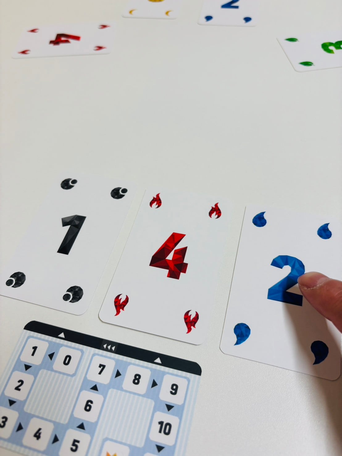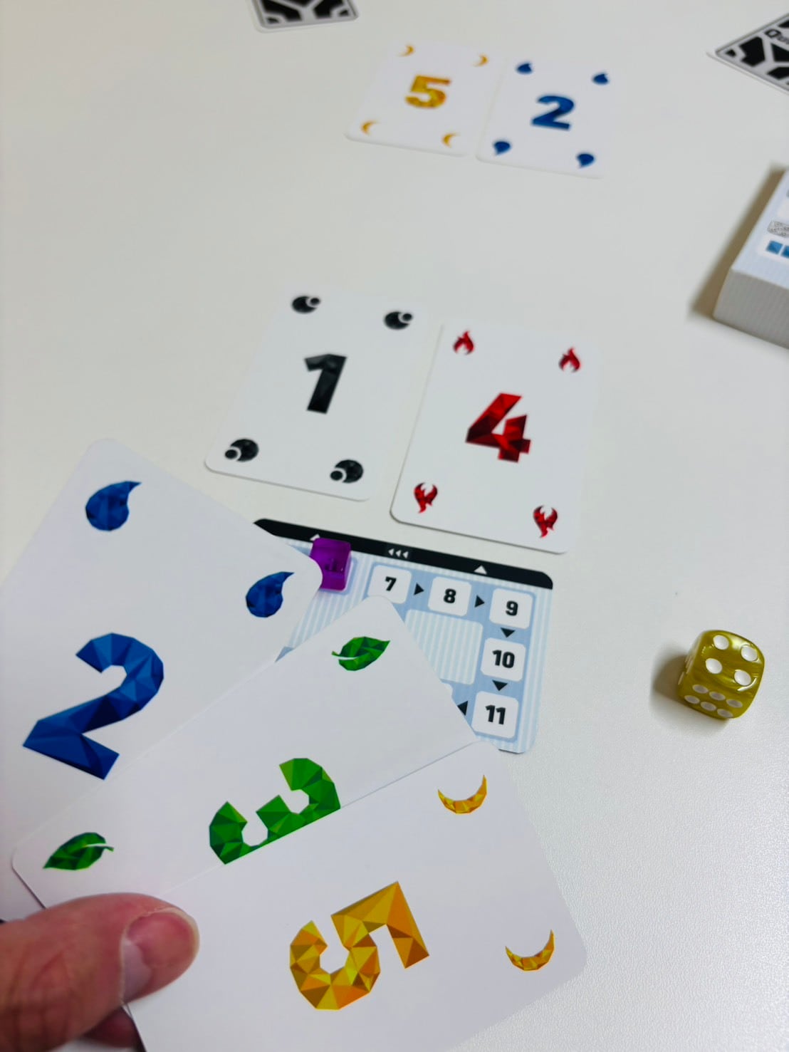 手札にある1~5のカードからランダムに2枚を公開し、残った3枚のうち1枚をウラ向きで出し合い、中央に公開されているカードと合わせて計5枚で完成する最も強い役はどれかを予想します。予想が終わったらカードを公開し、予想が当たった人数が少ないほど高得点が獲得できます。難しい役だとボーナス点が追加、誰も当たらなかったらボーナス点が加算されていきます。
