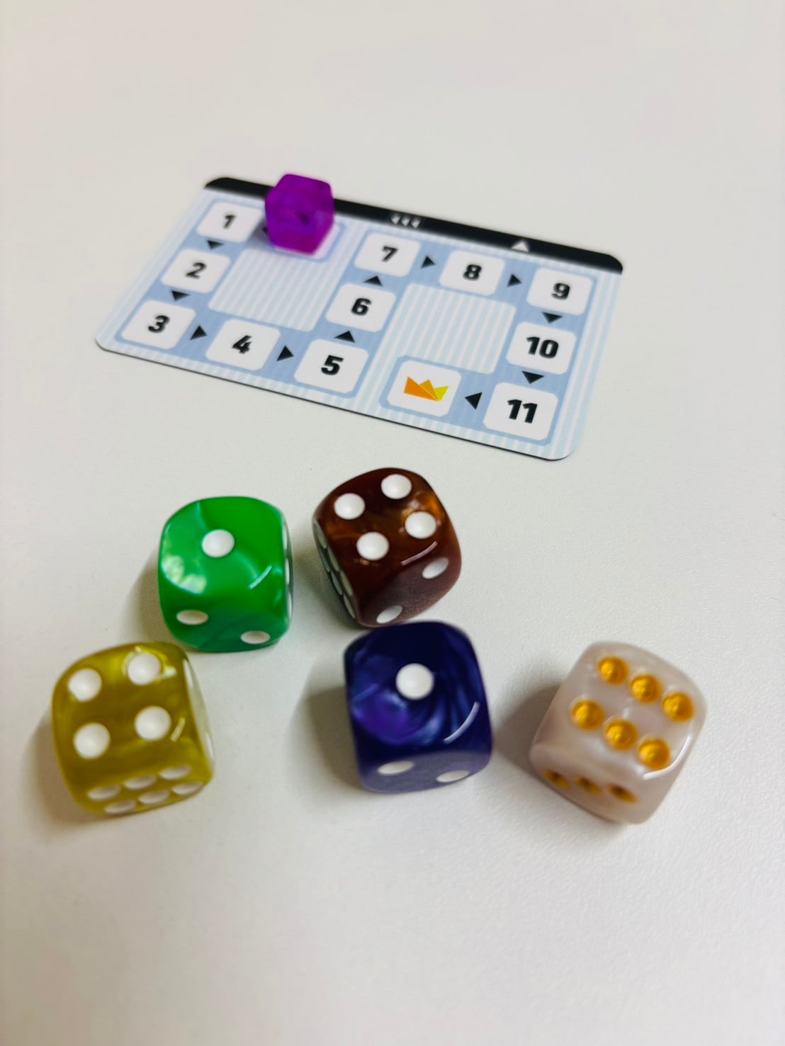1)各プレイヤーに得点カード、得点コマ、ダイスを配ります。