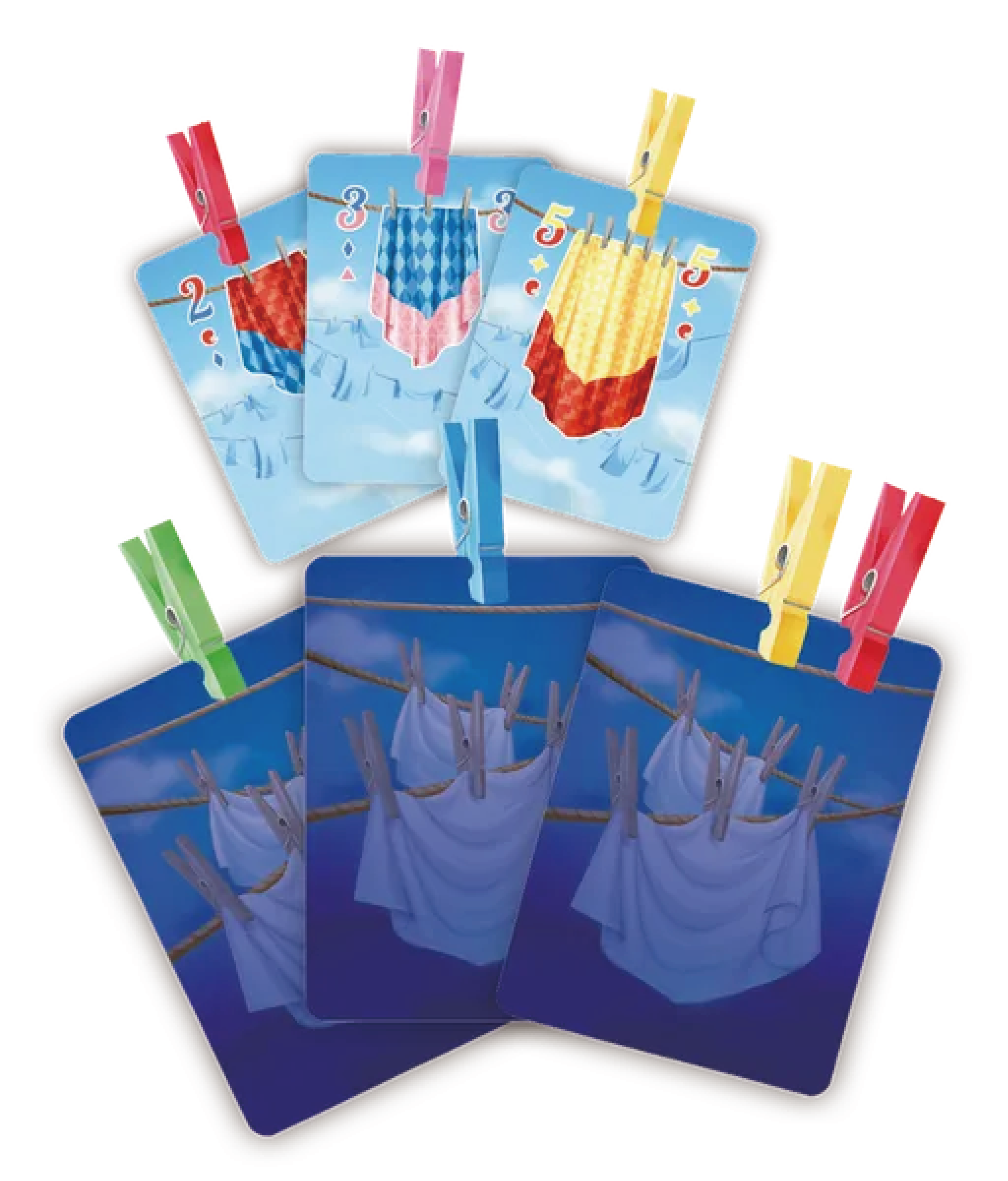 手札からカードを出す場合、場の中央にある条件(同じ数字、同じ色で統一など)に合うようにカードを出します。しかし、自分の手札の中身はわからないので、他のプレイヤーからもらったクリップによるヒントを目安に出していきます。クリップは布の色と数字を目安にカードに付けていきます。間違ってカードを出した場合はデンジャーゾーンに置かれ、デンジャーゾーンが規定枚数内に、条件にあったカードを一定数出したらクリアとなります。